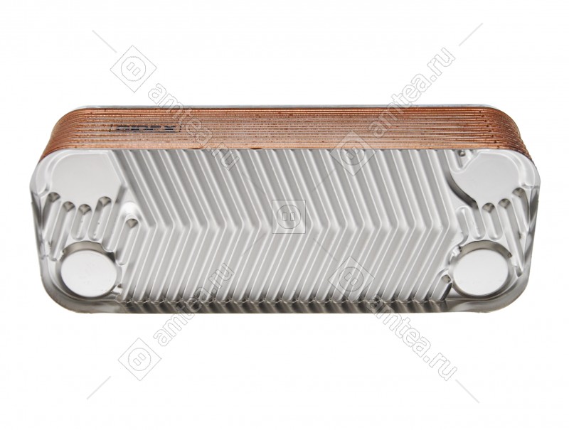 Служит для передачи тепловой энергии от одного тепоносителя к другому. Применяется в двухконтурных котлах. Причины выхода из строя - забивание отверстий солями, которые попадают из первичного теплообменника (который обогрвается газовым пламенем). Вторая причина - нарушение грметичности, т.е. теплообменник начинает подтекать в метсе спайки пластин. Неремонтопригоден, меняется на новый. 16 пластин
